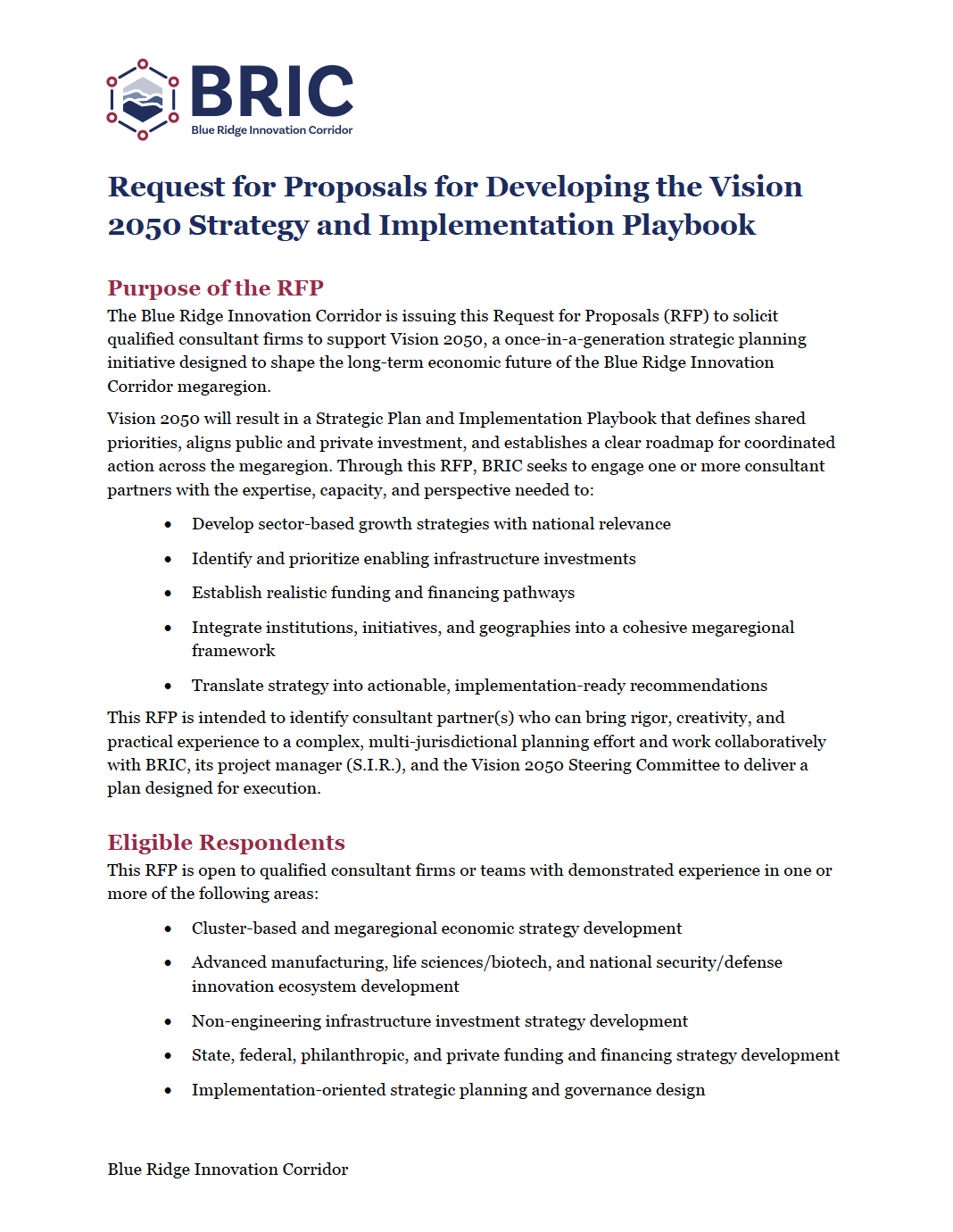 S.I.R. is serving as the overall project manager and integrator for Vision 2050, working closely with BRIC’s Board and the Vision 2050 Steering Committee. Through this RFP, BRIC is seeking senior-level, nationally recognized experts with direct experience building and scaling industry hubs or regional strategies. Firms may propose to lead one or more technical workstreams.